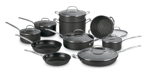 Cuisinart puts together all the most commonly used pots and pans in this comprehensive 17-piece set. Three covered saucepans hold 1-1/2, 2, and 3 quarts, perfect for those everyday tasks such as warming soup, cooking rice, or steaming vegetables. The 8- and 10-inch skillets slide out perfect French toast and pancakes, not to mention eggs over easy with bacon. Use the covered 12-inch skillet or 4-quart covered sauté pan, both with helper handles, for stir-fried vegetables, sautéed seafood, or braised beef. The covered 9-quart stockpot is perfect for big batches of chili and hearty soups. Two bonus items are the all-purpose covered steamer and deeper pasta insert that fit the stockpot and do away with having to use a colander for draining. Cleanup is easy, just a quick wash by hand takes care of any food residue. Nonstick, hard-anodized cookware is best kept out of the dishwasher. Cuisinart covers this gift-worthy cookware set with a limited lifetime warranty against manufacturer defects. --Ann Bieri