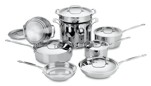 Cooks shopping for midweight stainless-steel cookware at a mid-range price may well have found their match with this cookware set from Cuisinart. Equipped to handle most common cooking tasks, the 14-piece set includes a 1-1/2- and 3-quart covered saucepan, an 8- and 10-inch covered skillet, a 4-quart covered saute with helper, and a 9-quart covered stockpot, as well as a 7-3/4-inch covered steamer insert and 9-1/2-inch covered pasta steamer insert.